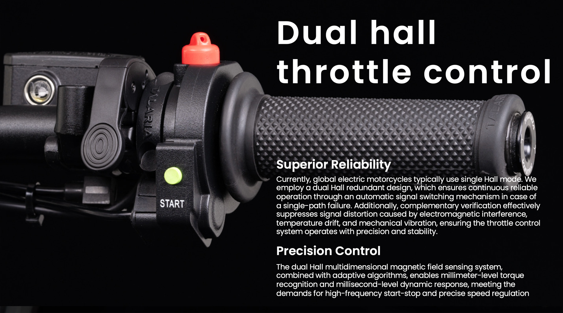Currently, global electric motorcycles typically use single Hall mode. We employ a dual Hall redundant design, which ensures continuous reliable operation through an automatic signal switching mechanism in case of a single-path failure. Additionally, complementary verification effectively suppresses signal distortion caused by electromagnetic interference, temperature drift, and mechanical vibration, ensuring the throttle control system operates with precision and stability.